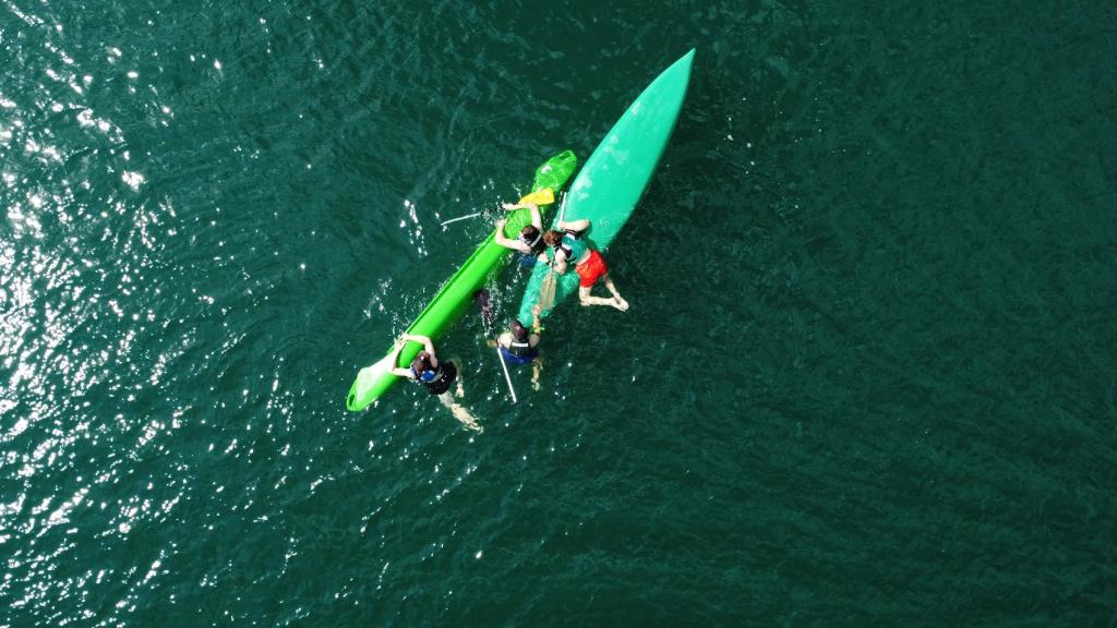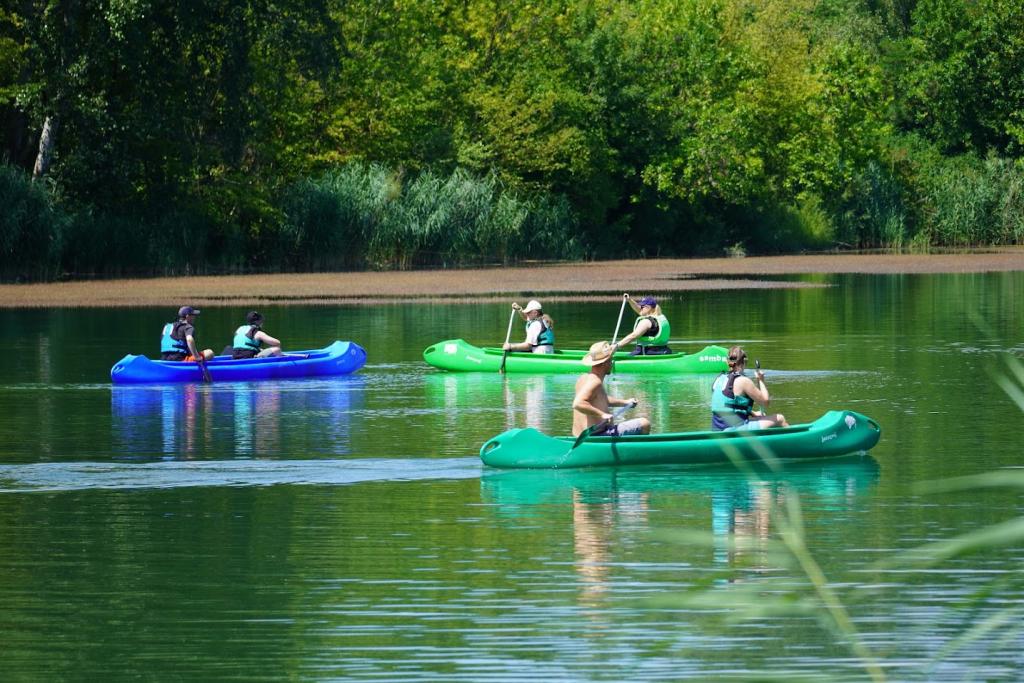 10:15 Inštruktáž, snáď jediný moment, kedy trieda sedí v lodiach na brehu a pádlami zaberá do trávy.