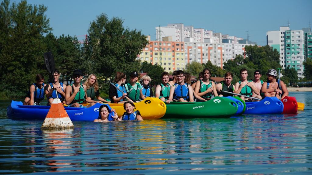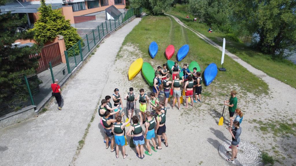 10:00 Rozcvička, sme v kruhu, v ruke máme pádlo a na povel pravá chytíme pádlo suseda. Väčšinou...