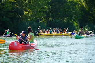 11:00 Súťaž. Všetky kánoe sú pri brehu a raft s učiteľmi im uteká. Niekedy utečieme, niekedy nie.